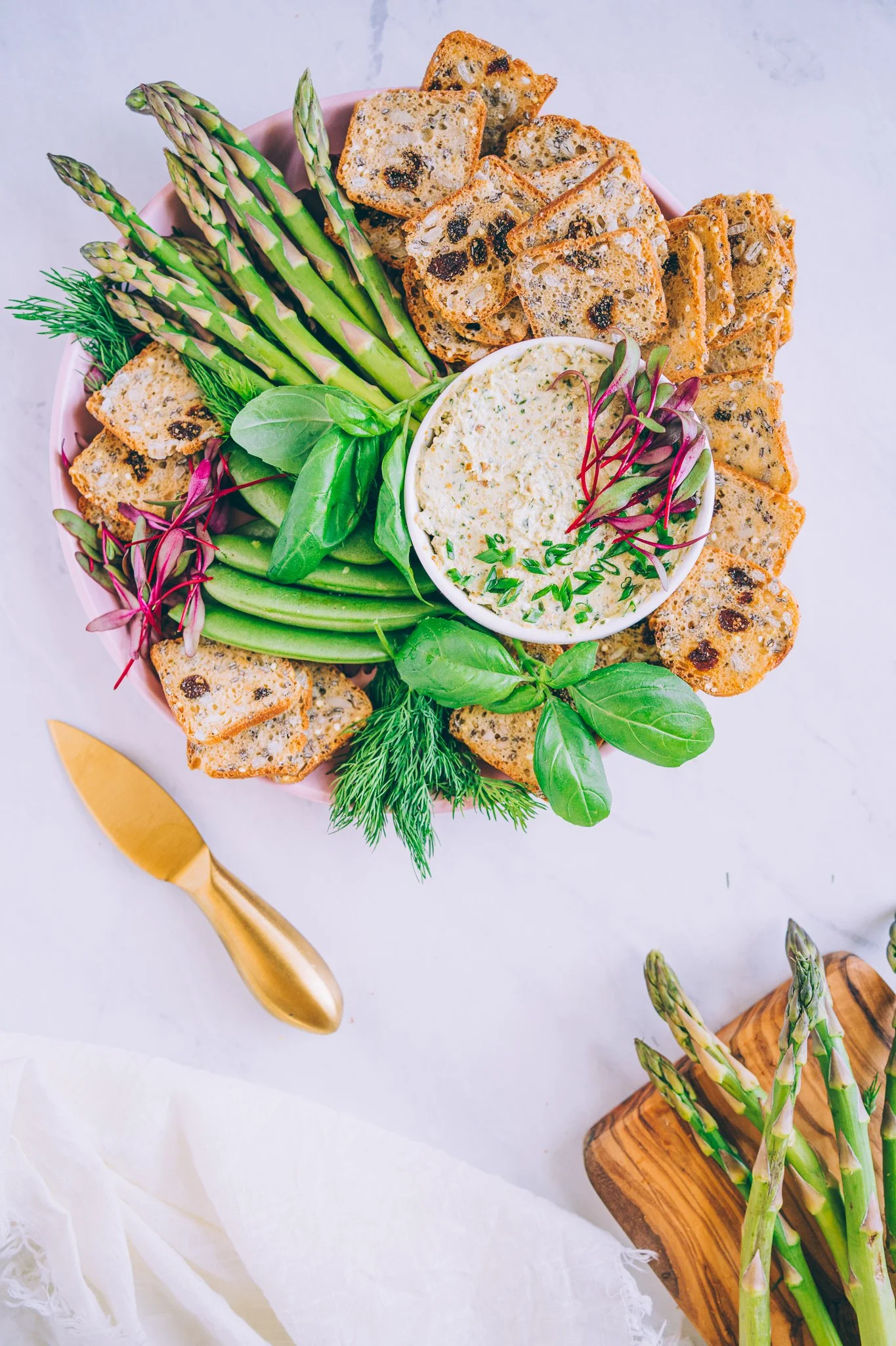 This Basil Pistachio Goat Cheese Spread is an excellent dip for charcuterie boards like this Spring Veggie Board (I love serving it with rustic herb crackers and veggies) and it also makes a delicious, tangy sandwich spread.