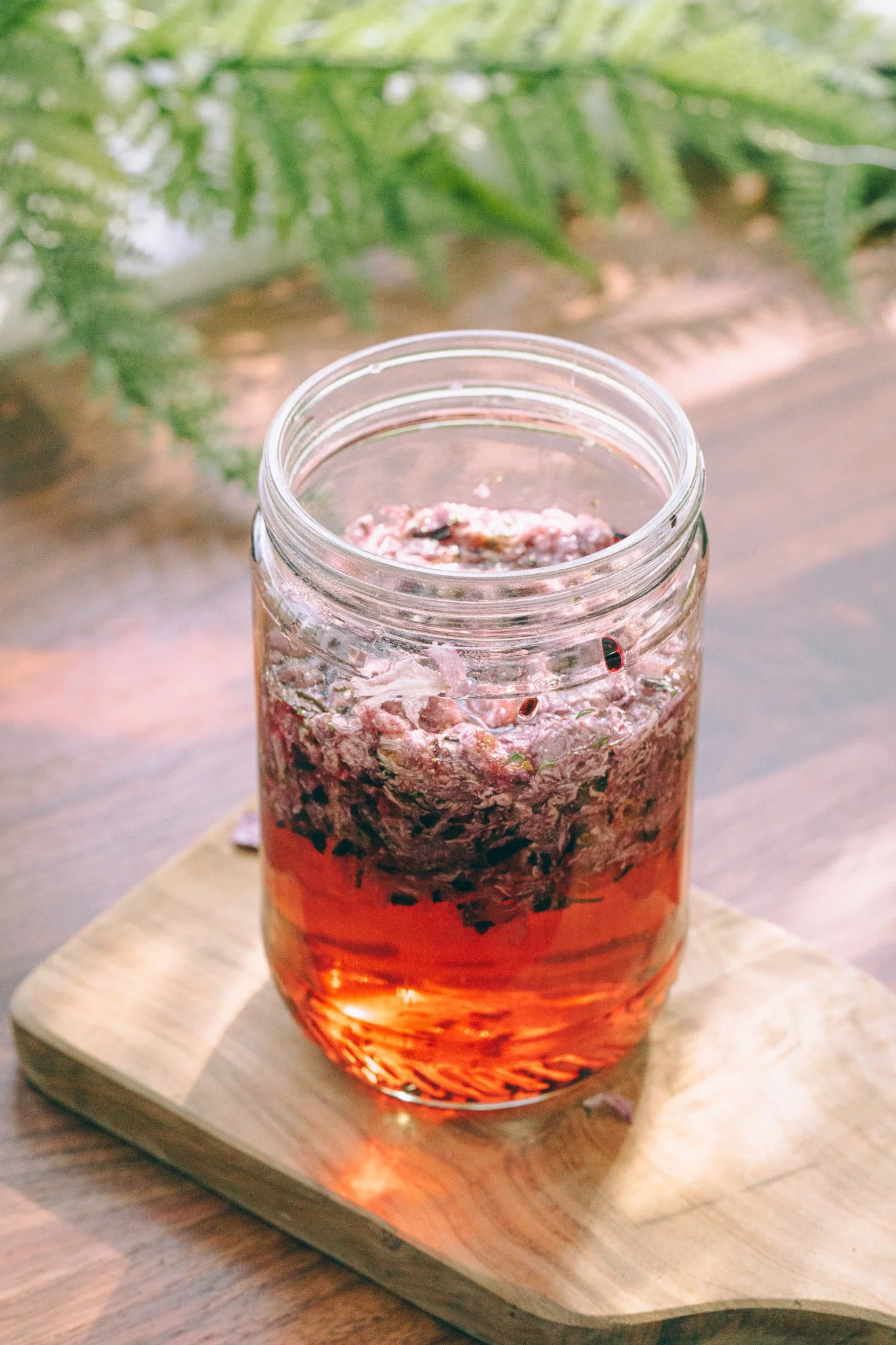 Add the cherry blossoms and hibiscus to a jar, then pour the hot simple syrup over the top and mix well. Steep for 10 minutes, then strain out the solids and allow the syrup to cool.