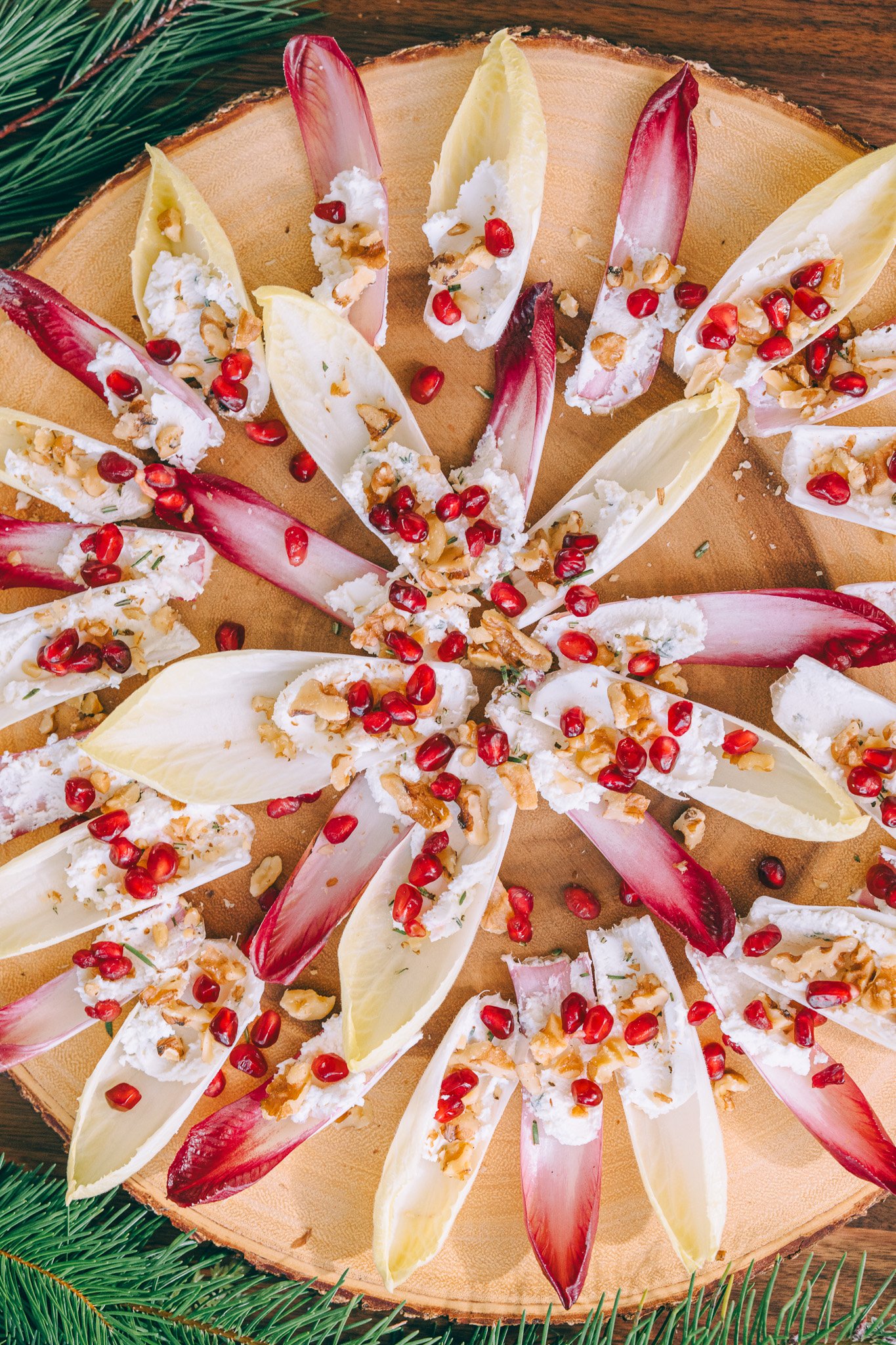 These adorable little endive bites are a wonderful, simple holiday appetizer. Crisp, slightly bitter endive leaves are topped with a savory goat cheese mixture, crunchy walnuts, and juicy, sweet pomegranate seeds.