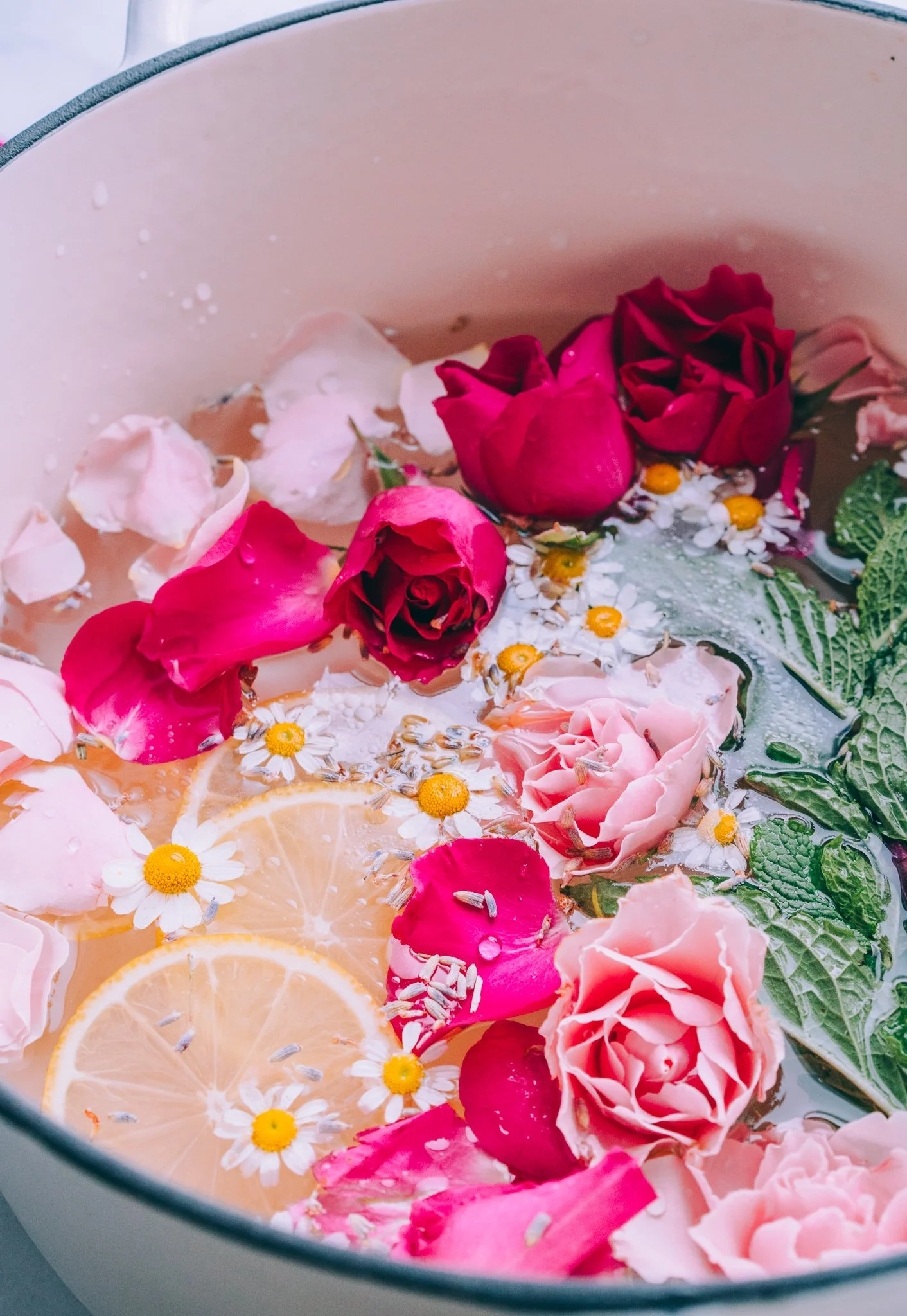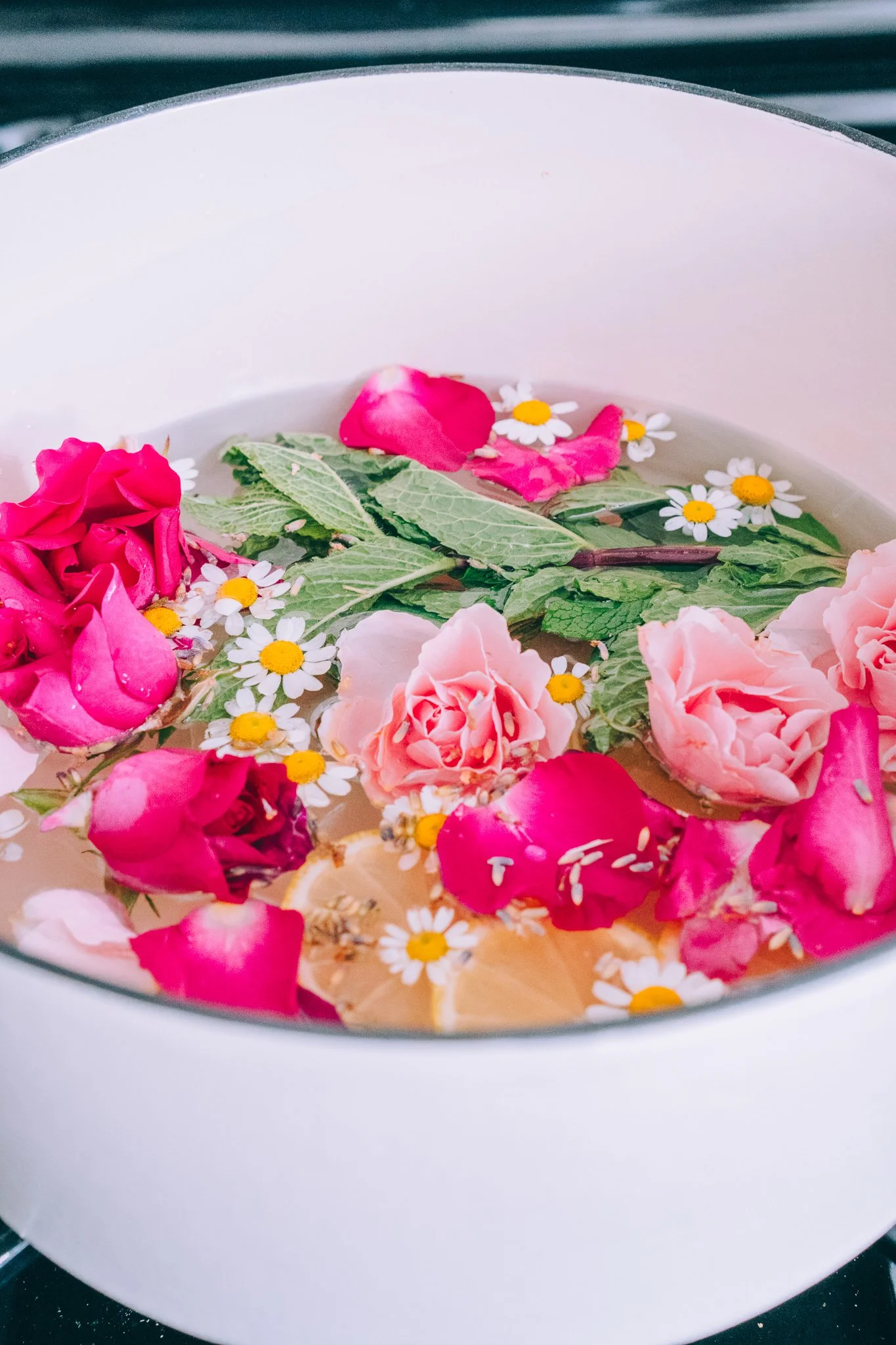 To make this simmer pot, simply combine the ingredients in a medium pot or dutch oven, add a few inches of water, and bring to a super gentle simmer over very low heat—if you overheat or boil fresh flowers, they won't smell good!!