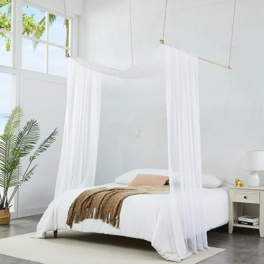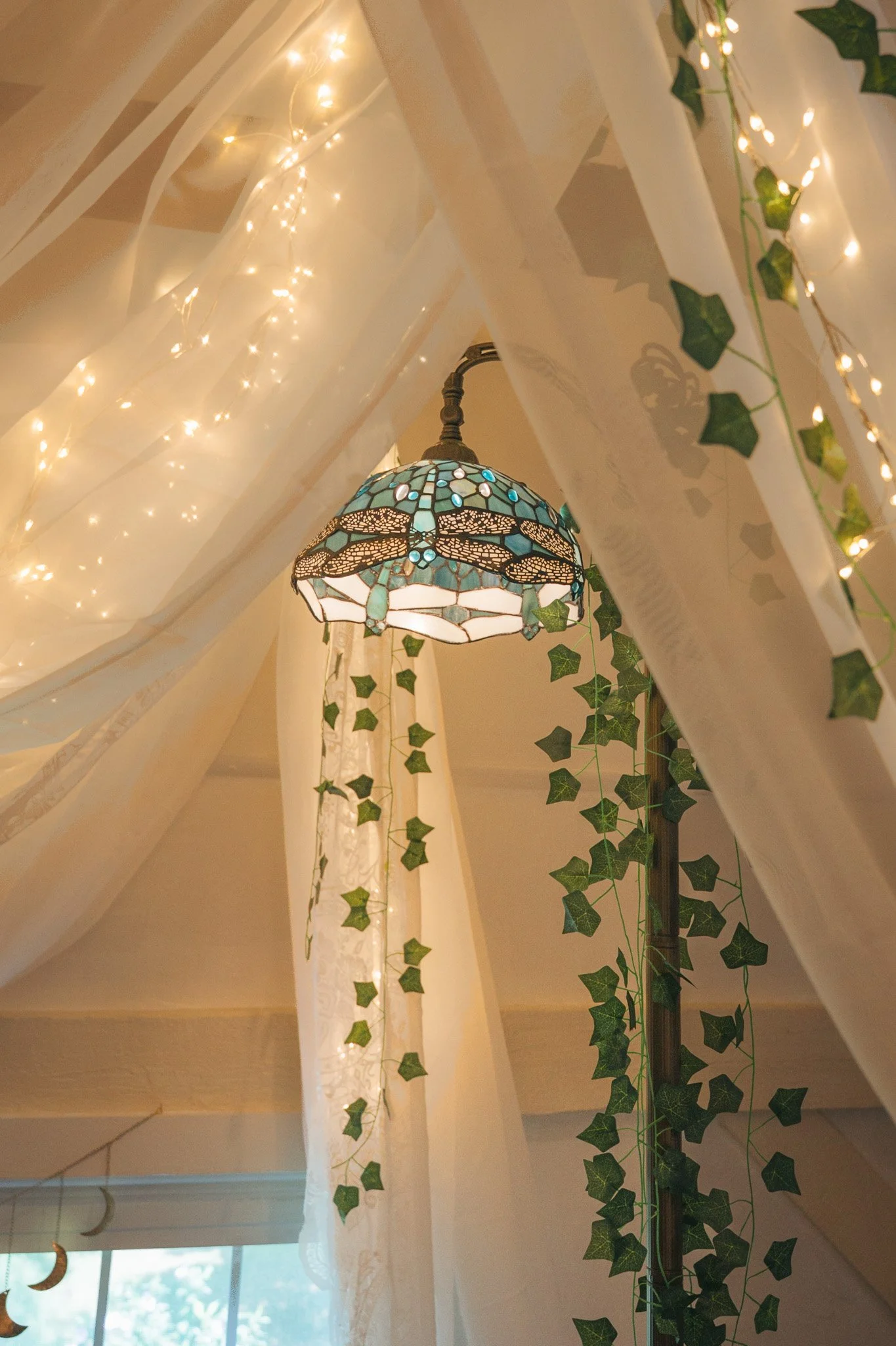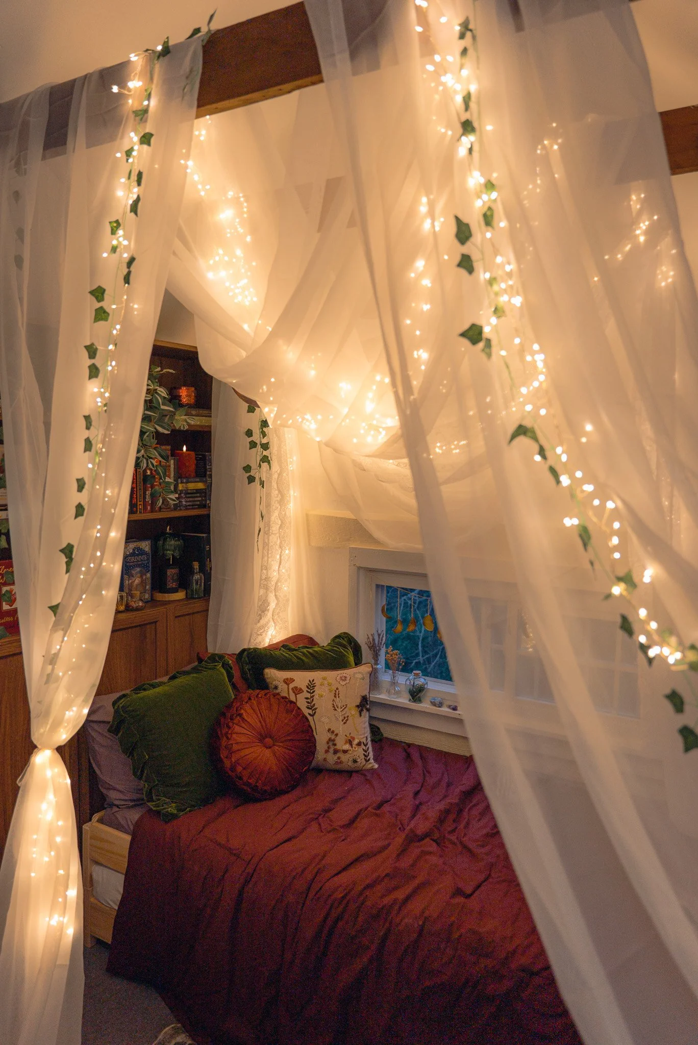 I draped sheer panels over the beams and tension rods in the room to create a dreamy canopy over the bed, then added clustered fairy lights on top of them. The effect was ethereal and celestial. For a pop of greenery, I hung some artificial ivy vines from the canopy as well.