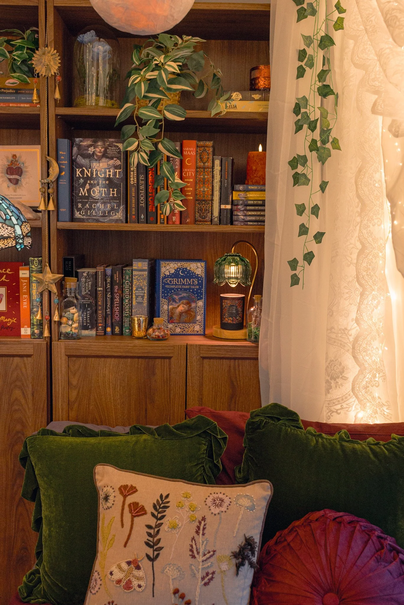 Lately, I’ve become enamored with the whimsigoth aesthetic—the rich colors, botanical and magical themes, and the combination of textures are so beautiful and perfect for a cozy reading nook. So I wanted to pull from the whimsigoth aesthetic when choosing the colors and design elements for this reading nook.